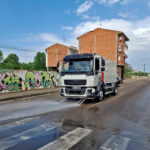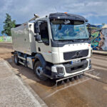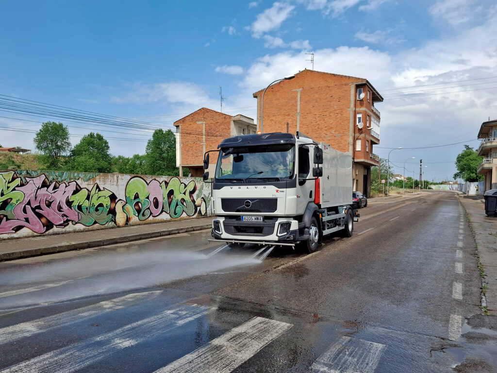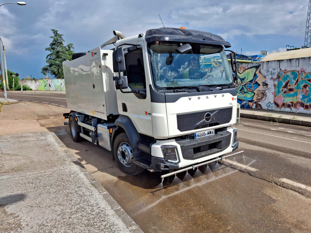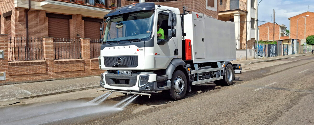 La baldeadora hidrostática montada sobre chasis Volvo, equipada con un depósito de agua de copolímero con capacidad para 8000 litros. Dispone de una bomba de media presión con rendimiento de 250 l/min a 18 bar, que alimentar los distintos sistemas de trabajo.